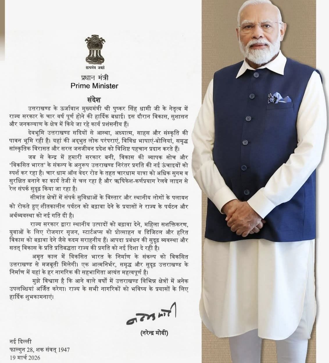 प्रधानमंत्री ने प्रदेश के सीमांत क्षेत्रों में कनेक्टिविटी बढ़ाने और शीतकालीन पर्यटन को प्रोत्साहित करने के प्रयासों को भी सराहा। उन्होंने कहा कि इन पहलों से न केवल पर्यटन को बढ़ावा मिला है, बल्कि पलायन रोकने और स्थानीय अर्थव्यवस्था को सशक्त बनाने में भी मदद मिली है। अपने संदेश में प्रधानमंत्री ने राज्य सरकार द्वारा स्थानीय उत्पादों के प्रोत्साहन, महिला सशक्तिकरण, युवाओं के लिए रोजगार सृजन, स्टार्टअप्स को बढ़ावा तथा डिजिटल और हरित विकास जैसे प्रयासों को सराहनीय बताया। साथ ही, आपदा प्रबंधन की सुदृढ़ व्यवस्था और सतत विकास के प्रति प्रतिबद्धता को राज्य की प्रगति के लिए महत्वपूर्ण बताया।