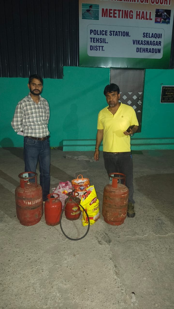 बंजारगली सेलाकुई पाण्डेय स्टोर प्रतिष्ठान पर 14.2 केजी के 02 सिलेंडर एवं 05 केजी k 05 सिलेंडर रिफिलिंग किट सहित जब्त किए गए