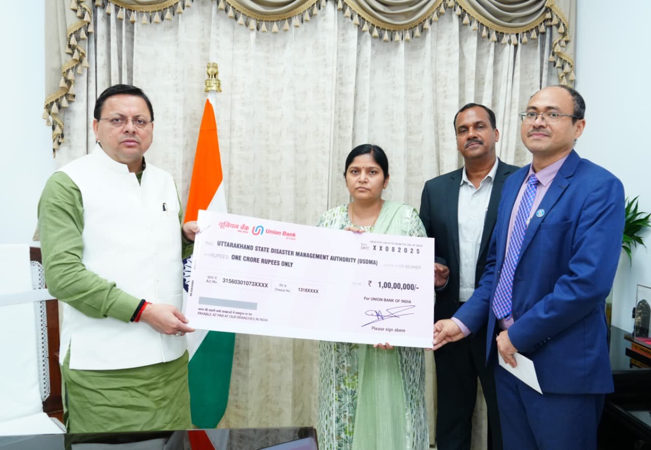 देहरादून। मुख्यमंत्री श्री पुष्कर सिंह धामी से आज मुख्यमंत्री आवास में यूनियन बैंक ऑफ़ इंडिया के प्रतिनिधिमंडल ने भेंट की। इस दौरान यूनियन बैंक ऑफ़ इंडिया द्वारा उत्तरकाशी जिले के धराली एवं हर्षिल क्षेत्र में आई आपदा के राहत कार्यों के लिए ₹ 1 करोड़ की धनराशि का योगदान दिया गया।