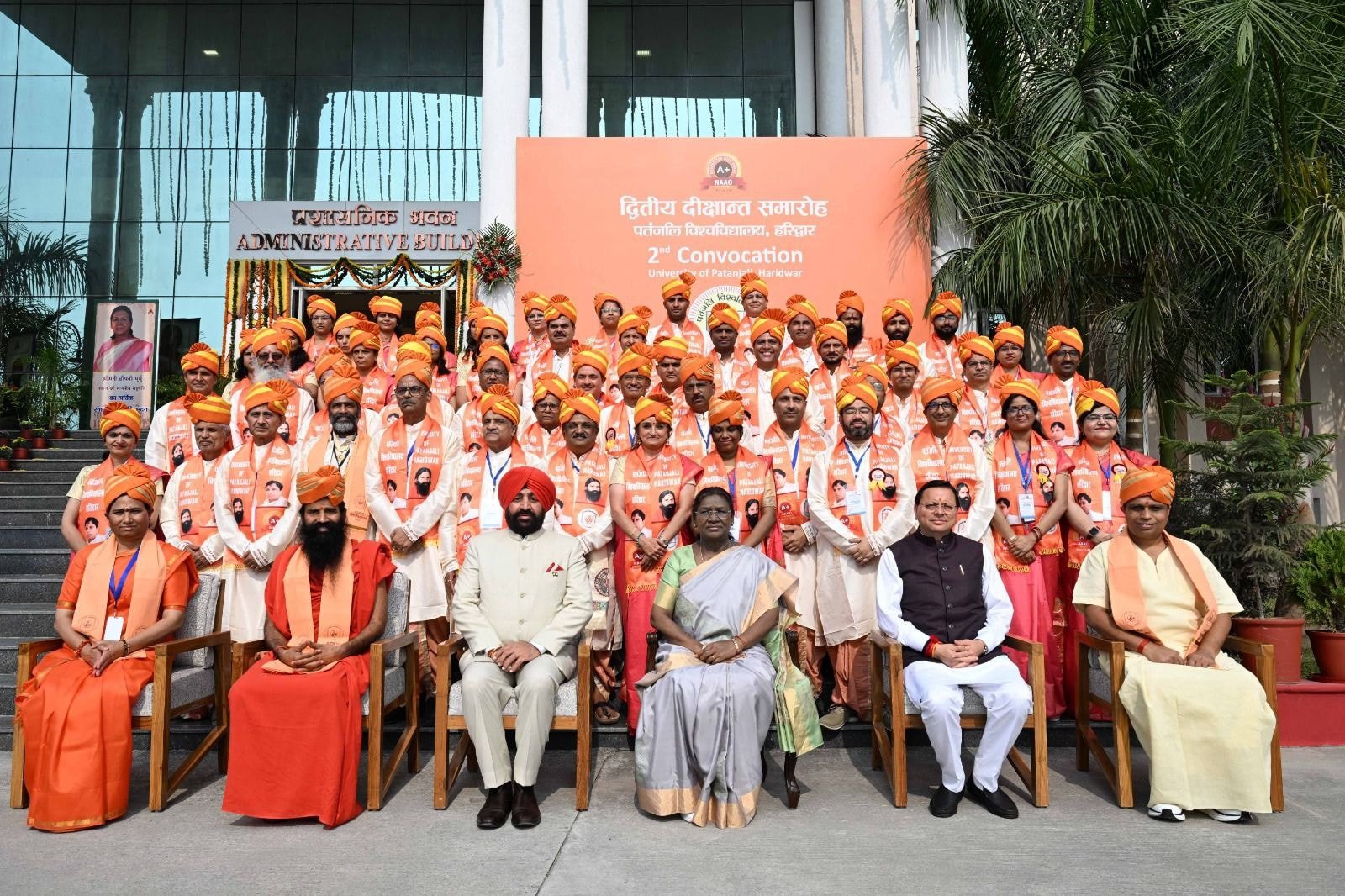हरिद्वार। ष्ट्रपति श्रीमती द्रौपदी मुर्मु ने पतंजलि विश्वविद्यालय हरिद्वार के द्वितीय दीक्षांत समारोह में स्वर्ण पदक प्राप्त विद्यार्थियों को सम्मानित किया। आज आयोजित इस कार्यक्रम में कुल 1454 विद्यार्थियों को उपाधि प्रदान की गई। 62 शोधार्थियों को विद्या वारिधि और 3 शोधार्थियों को विद्या वाचस्पति की उपाधि प्रदान की गई, जबकि 615 विद्यार्थियों को परास्नातक और 774 विद्यार्थियों को स्नातक की उपाधि प्रदान की गई। इस अवसर पर राज्यपाल लेफ्टिनेंट जनरल गुरमीत सिंह (से नि.) ने राष्ट्रपति को राष्ट्रपति भवन की विविध वनस्पतियों पर आधारित दो पुस्तकें ‘फ्लोरा ऑफ राष्ट्रपति भवन’ एवं ‘मेडिसिनल प्लांट्स ऑफ राष्ट्रपति भवन’ की प्रतिलिपियाँ भी भेंट कीं।