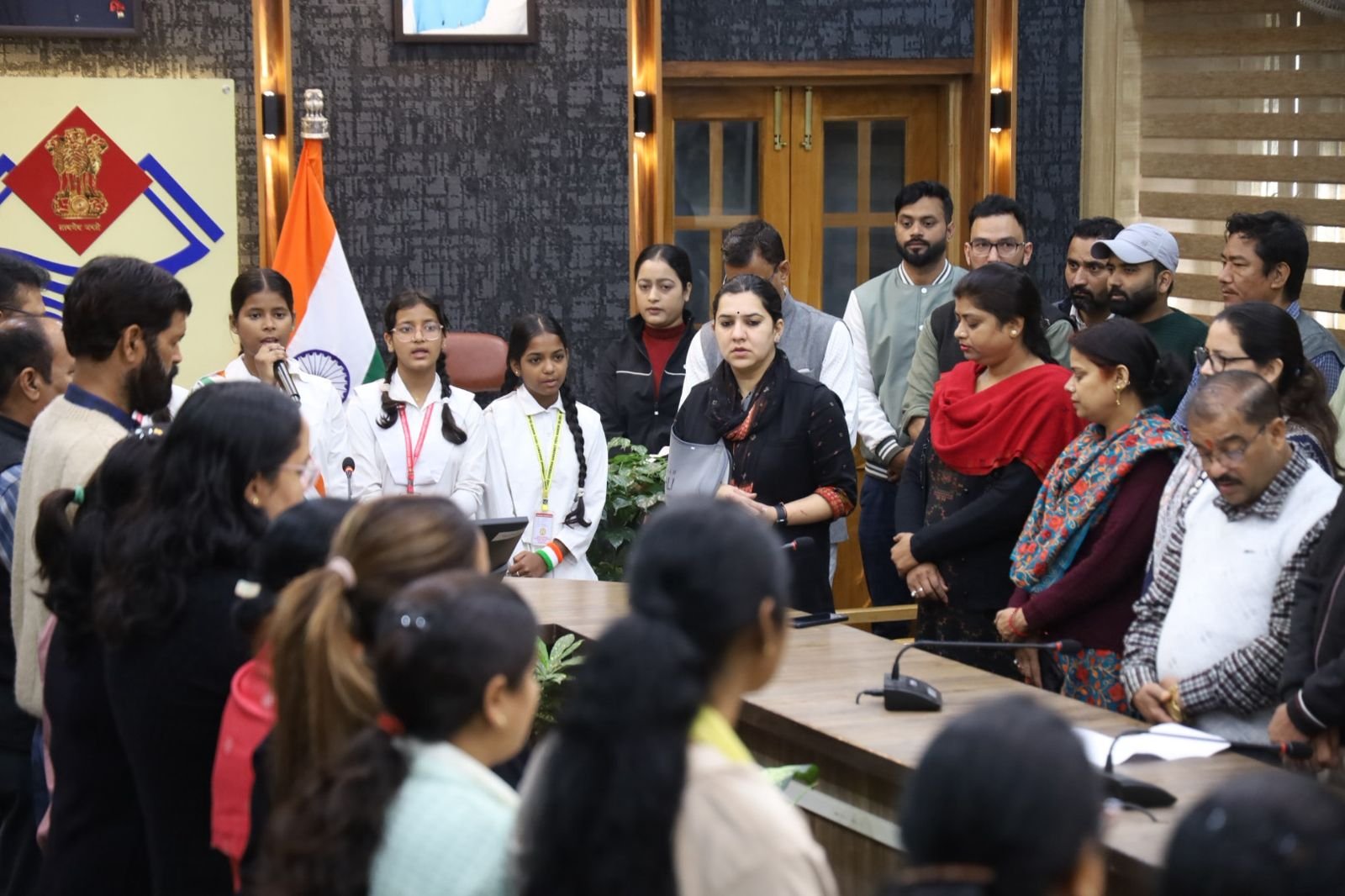 देहरादून। भारत वर्ष के राष्ट्रगीत ‘‘वंदे मातरम्’’ के 150 वर्ष पूर्ण होने के अवसर जनपद के सभी सरकारी, गैर सरकारी कार्यालयों, शिक्षण संस्थानों एवं सामाजिक संगठनों में प्रातः 10 बजे ‘‘वंदे मातरम्’’ का गायन किया गया। जिलाधिकारी सविन बंसल के दिशा निर्देशन में जिला कार्यालय में उप जिलाधिकारी अपूर्वा सिंह की मौजूदगी में क्लेक्ट्रेट परिसर के समस्त अधिकारियों, कार्मिकों एवं श्री गोर्वधन सरस्वती विद्या मंदिर की छात्राओं की उपस्थिति में वंदे मातरम् का सामूहिक गायन किया गया। इस मौके पर देशभक्ति से ओत-प्रोत वातावरण में अधिकारीगण, कार्मिक, शिक्षक, विद्यार्थी सभी उत्साहपूर्वक शामिल हुए।